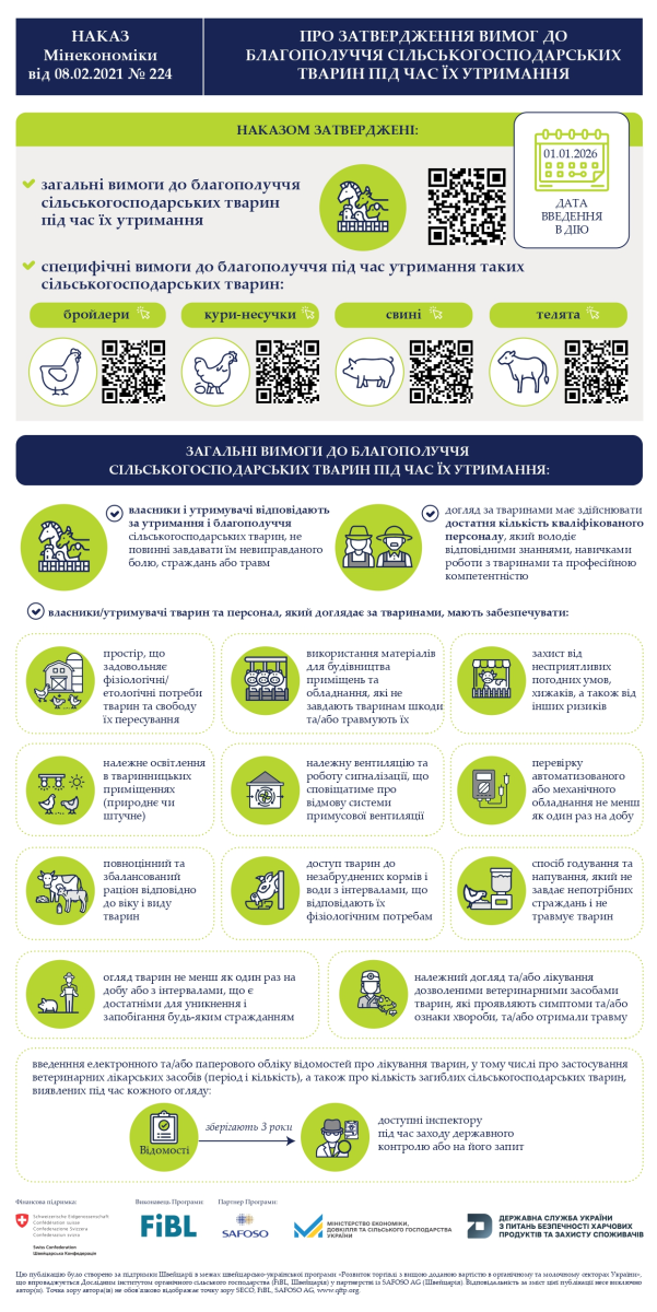 Від 1 січня 2026 року в Україні почали діяти нові євроінтеграційні вимоги щодо утримання сільськогосподарських тварин. Вони затверджені наказом Міністерства розвитку економіки, торгівлі та сільського господарства України №224 від 08 лютого 2021 року.