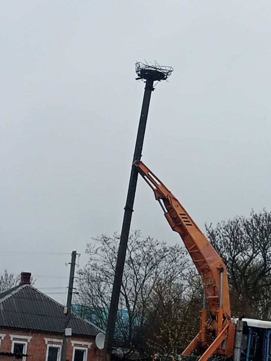 Отож, Олександр виготовив комфортну конструкцію з металу, шини та гілок -основу для майбутньої оселі птахів, знайшов стовп. А працівники РЕМу допомогли все це установити.